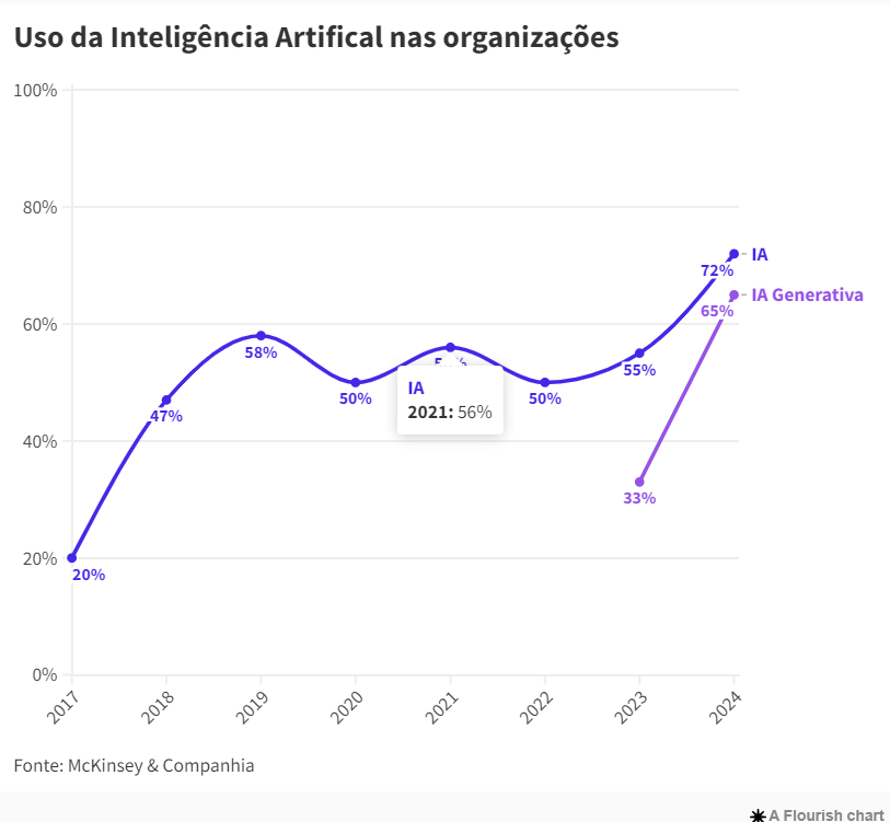Em meio a cada vez mais investimento das empresas no desenvolvimento dessa tecnologia, a IA generativa (Gen IA) também acompanhou esse movimento, indo de 33% em 2023 para uma presença de 65% neste ano.
